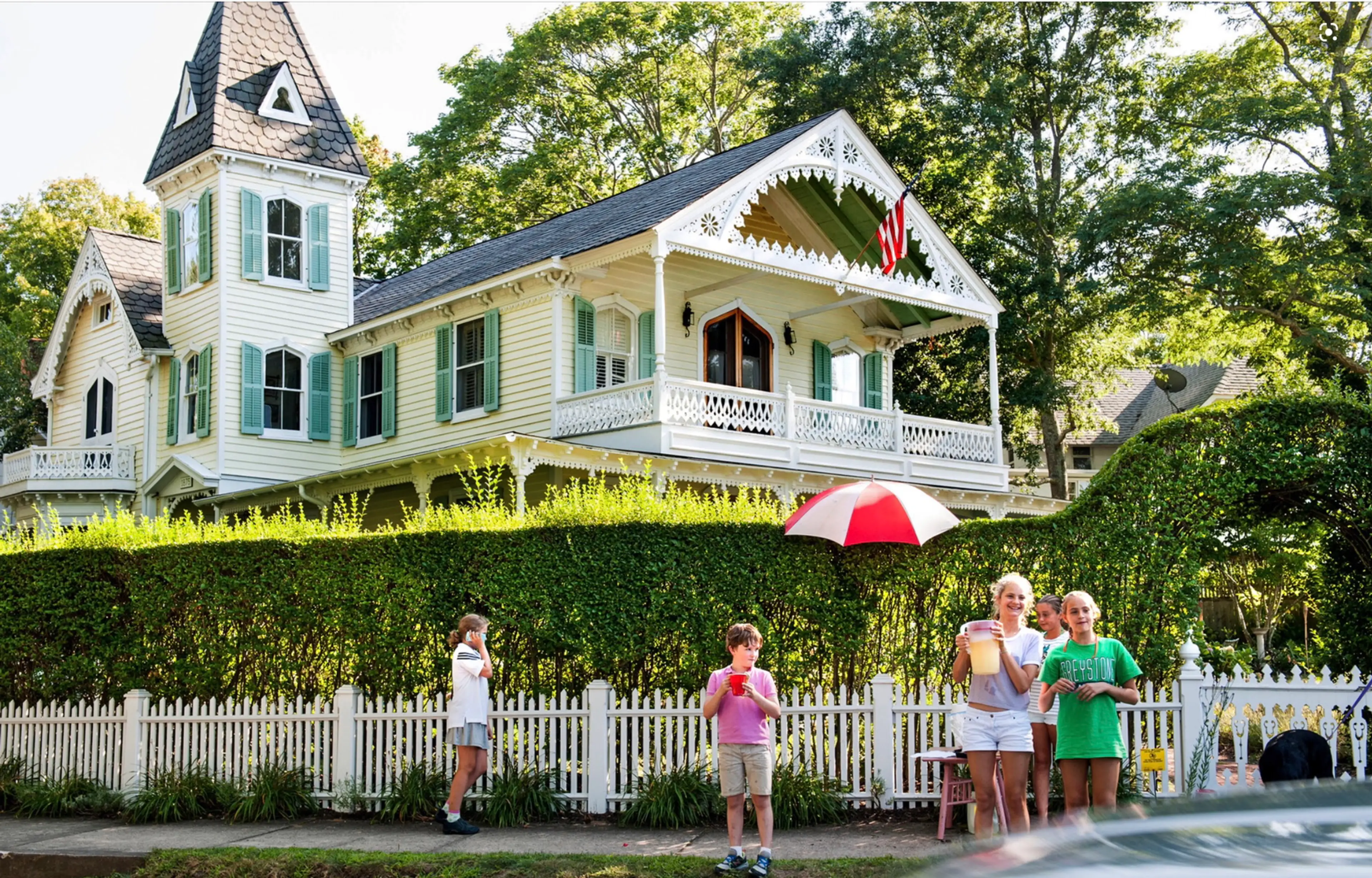 The classic comfort of this home welcomes you with period details such as gingerbread gothic carpentry details, white picket fence, hedge arches, gabled roofs, a famous leaning tower, and plenty of nooks throughout the house to enjoy. Hide away in one of the five bedrooms, enjoy an evening cocktail on the wraparound porch looking out to Greenport Harbor, or lounge around the property with your favorite book.